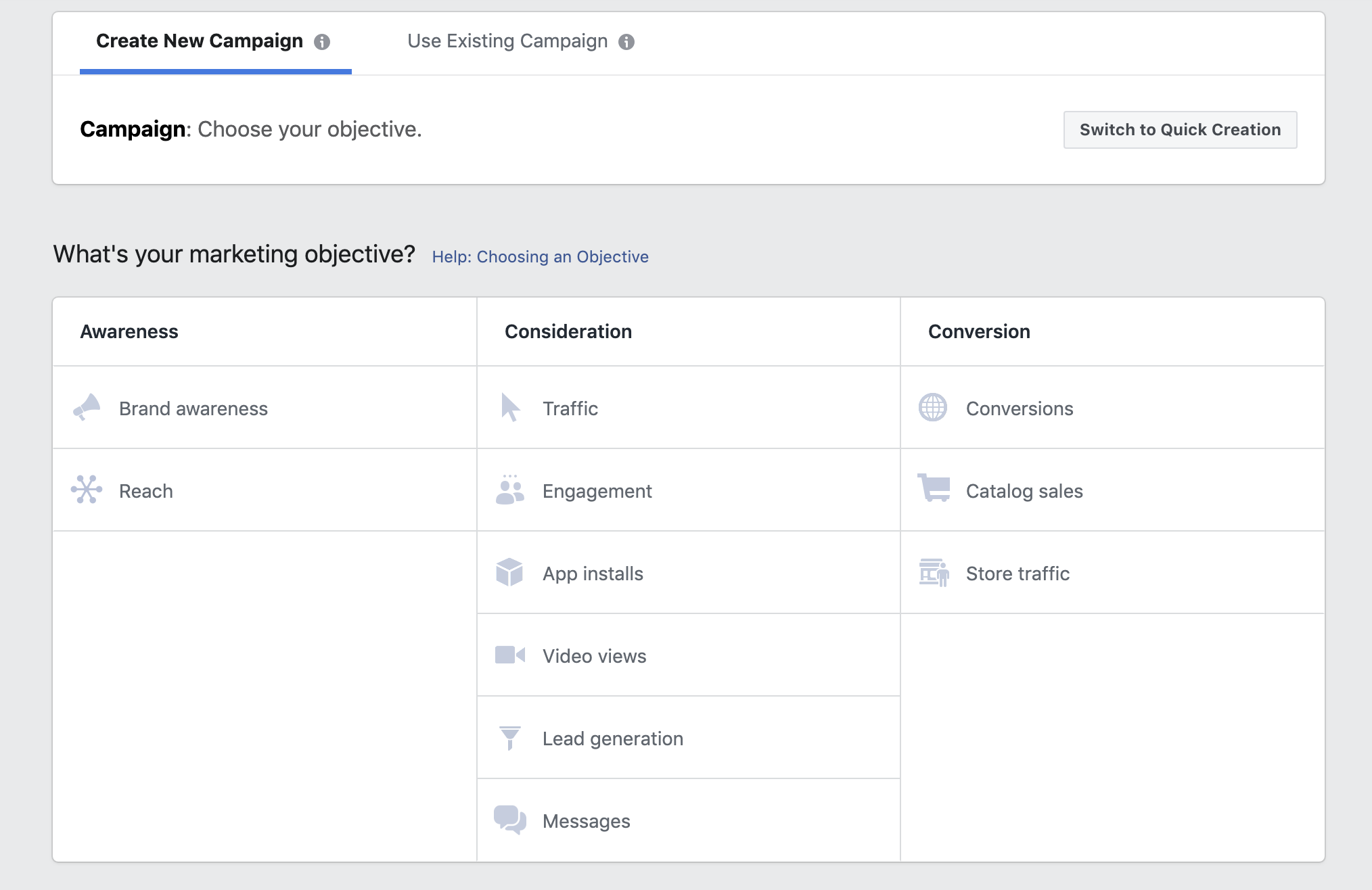 Facebook offers a variety of campaign objectives when you are first laying out your ad campaign. They lay out these objectives in something of a sideways funnel. The objectives at the left are useful for bringing people into your funnel, and educating them about your offerings. As you move further to the right, you are dealing with closing leads and making conversions.