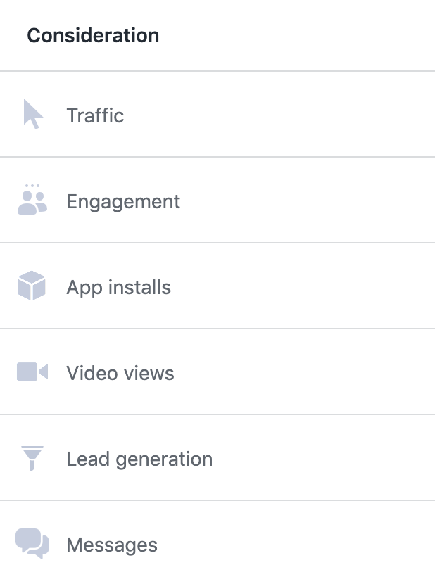 The consideration stage is where you start to bring in leads, and put together lists of folks that you can remarket to. The goal in this stage is to bring traffic to your site or offer, get leads by having people fill out a form—generally, just getting people to engage with your content. Once someone has engaged with your content on Facebook, you can target them with future ads, further down the funnel.