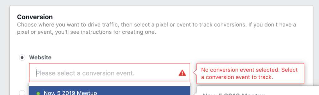 On the next screen, you’ll have the option to select your conversion event. We’ve been using website conversions, so leave the radio select button on Website, and find your custom conversion in the drop down list.