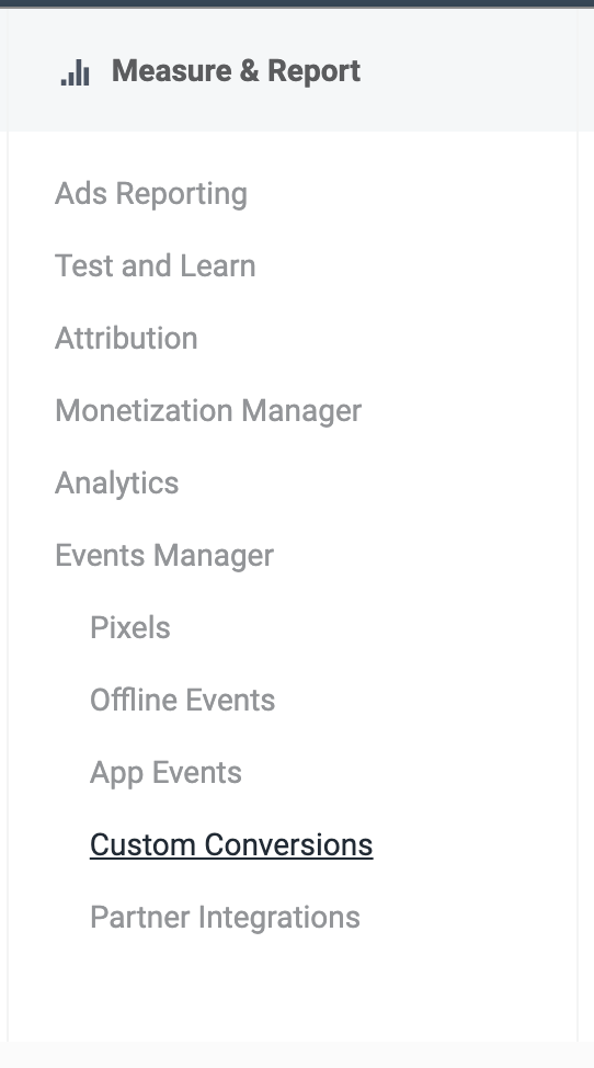 In your Facebook business manager, under Measure and Report, you’ll see Custom Conversions nestled under the Events Manager heading. Click on Custom Conversions, and you’ll be taken to a page of all of your custom conversions, with the option to create a new one listed in the upper right corner. Click Create Custom Conversion to get started.