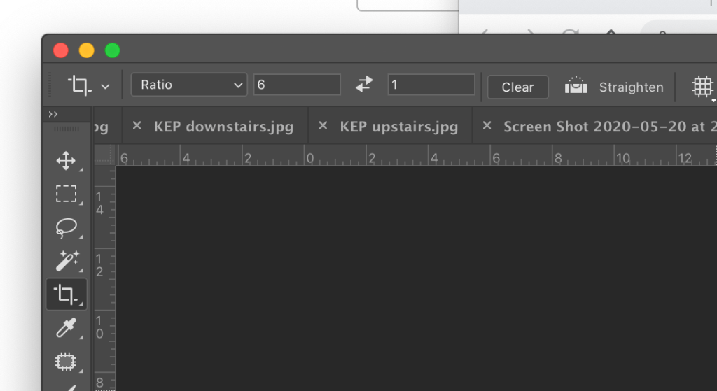 Select the Crop tool. In the top menu bar, you’ll be able to toggle between a few different preset cropping options. Choose “Ratio” and set your width and height (in this case 6 to 1).