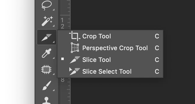 Nestled under your Crop tool (hold down on the Crop tool, and more options will appear), you’ll find the Slice tool. Select the Slice tool, and use it to draw a box around your entire image. Your image should now have this little frame around it, with a small blue box in the upper left corner.