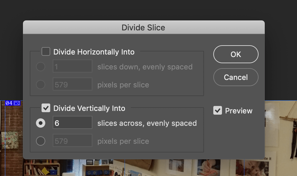 Right click on that small blue box. You’ll see the option to “Divide Slice.” Select that option, and you’ll be brought to a pop-up menu. Select “Divide Vertically Into” and enter your number of “slices” (in this case, 6).